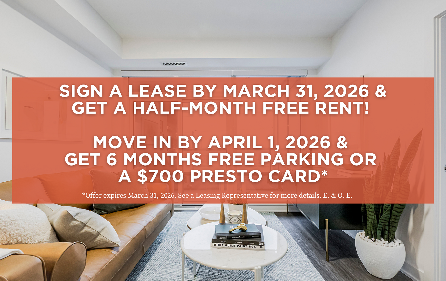 Half-Month FREE Rent + Move in by April 1, 2026 & get 6 Months FREE Parking OR a $700 PRESTO Card*